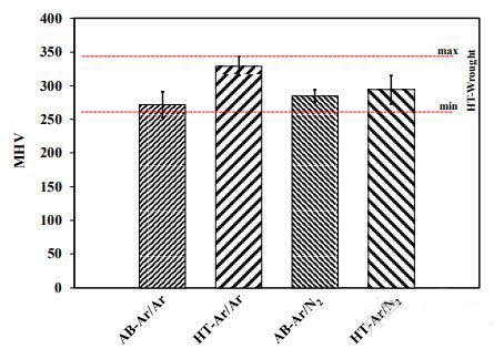 4、“HT-Ar/Ar試樣的硬度高于HT-Ar/N2試樣。這是由于在氬氣氛下制造的奧氏體基體與馬氏體微觀結構相比具有更高的沉淀硬化能力。