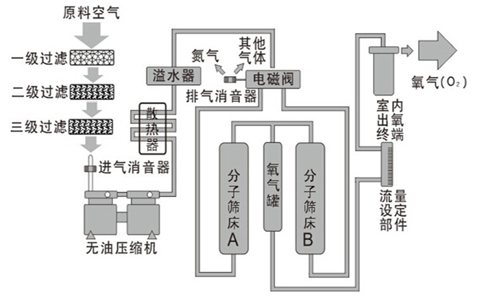 以空氣為原料,采用變壓吸附技術(shù),利用氧氣標(biāo)準(zhǔn)達(dá)到醫(yī)用氧水平在加壓狀態(tài)下對氮的吸附容量增加,減壓時(shí)對氮的吸附容量減少的特性,形成加壓吸附、減壓脫附的循環(huán)過程,實(shí)現(xiàn)空氣中氧、氮的分離,連續(xù)制取彌散使用的氧氣,氧氣質(zhì)量較高。